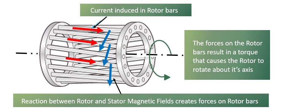 Because the Rotor is located in the rotating magnetic field of the Stator, the lines of magnetic flux that are produced will cut the Rotor bars and induce a voltage in the Rotor.  This will in turn result in an electrical current flowing in the Rotor bars (indicated in Figure 2 by the red arrows), which will generate its own magnetic field around the Rotor bars.  This magnetic field interacts with the Stator magnetic field to produce a force on the Rotor bars, causing the Rotor to rotate around its axis.